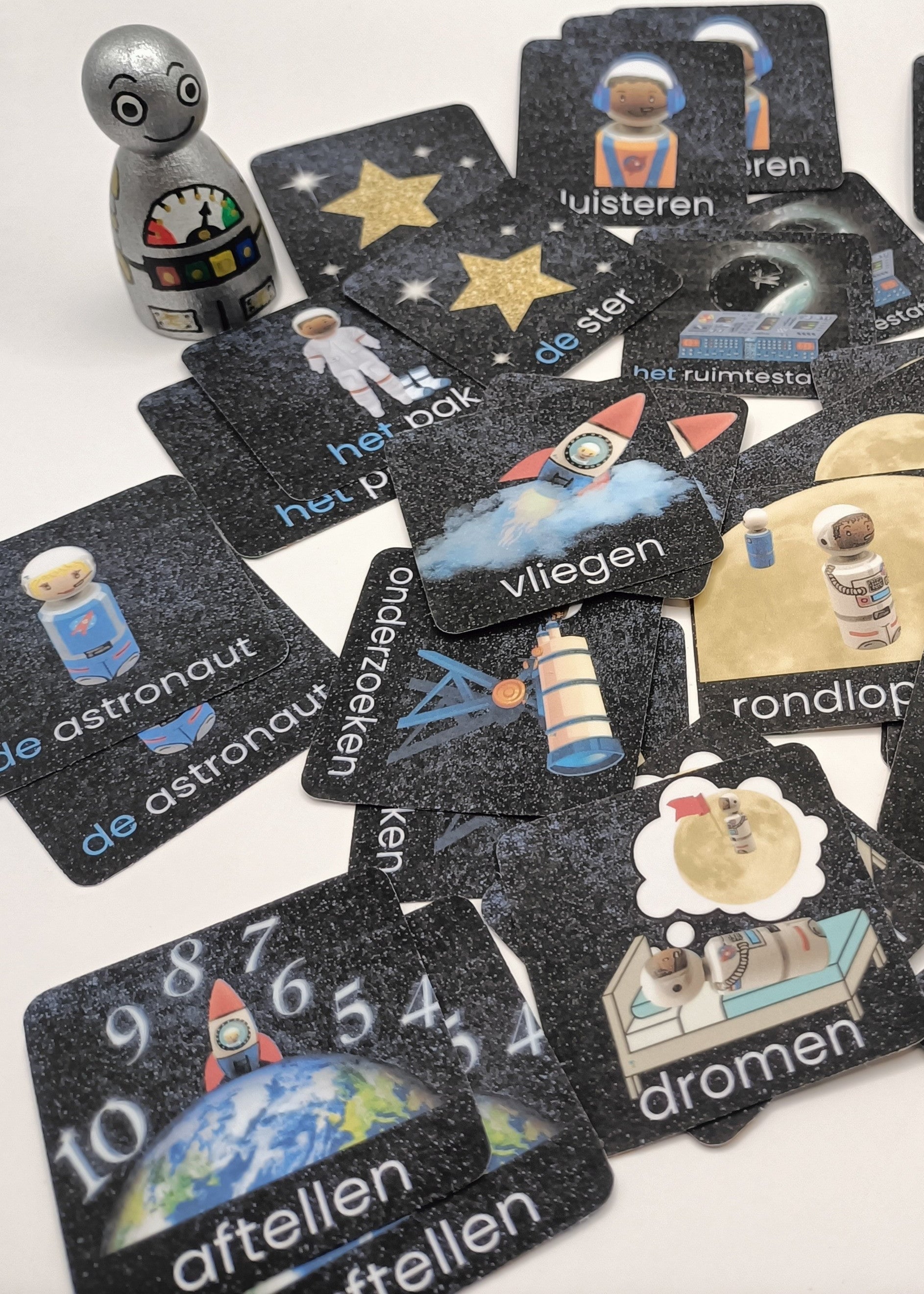 Tip: De woordplaten uit het thema de ruimte passen bij memoryspel 1. Dezelfde plaatjes zijn daarin verwerkt. Wil je deze ook bestellen? Kijk dan naar de taalbundel.
