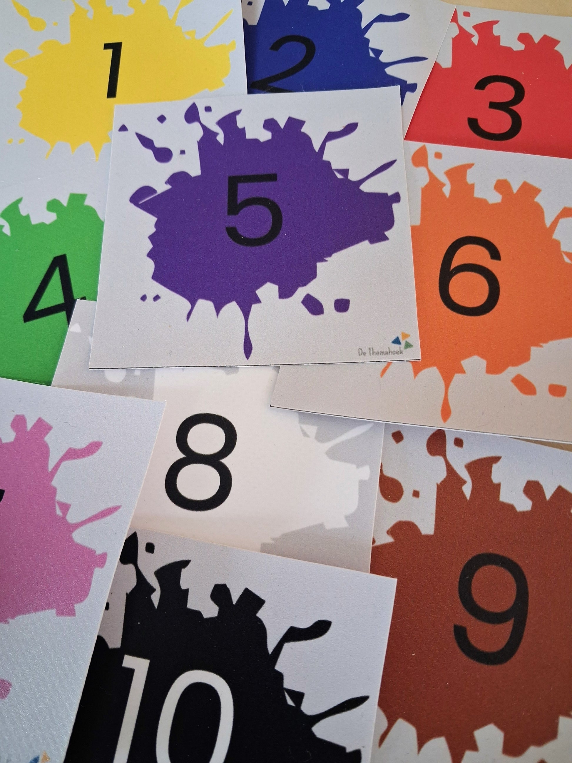- cijferkaarten (cijfers t/m 20 op verschillende kleuren verfvlekken)